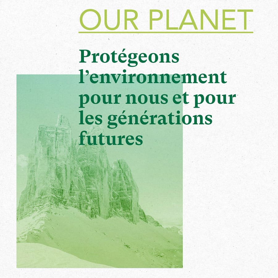 • OUR PLANET : Nous nous engageons dans une gestion responsable des ressources, en privilégiant le recyclage des matériaux, la consommation raisonnée et la réduction de notre empreinte carbone.